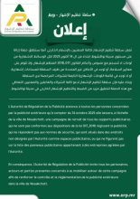 إعلان: تعلن سلطة تنظيم الإشهار لكافة المعنيين بالإشهار الخارجي أنها ستطلق حملة إزالة على مستوى مدينة نواكشوط ابتداء من ال 14 أكتوبر 2025 لكل الوسائط الاشهارية من لوحات لا تنسجم مع نصوص وأحكام...