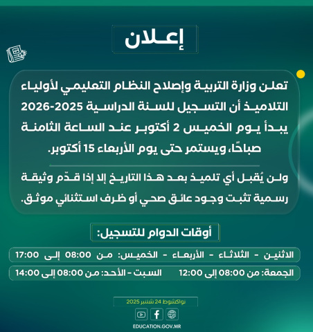 وقالت الوزارة في إعلان لها إن التسجيل للسنة الدراسية 2025- 2026 يبدأ يوم الخميس 2 أكتوبر ويستمر حتى يوم الأربعاء 15 أكتوبر.
