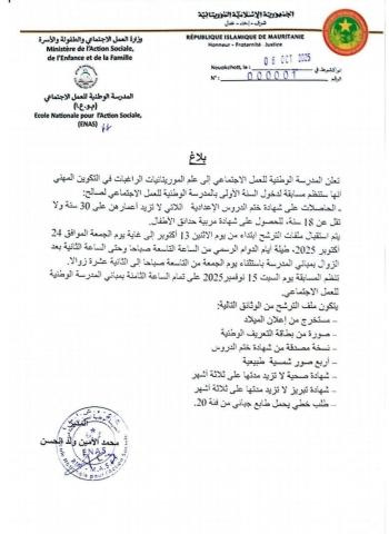 أعلنت المدرسة الوطنية للعمل الاجتماعي عن تنظيم مسابقة لاكتتاب الموريتانيين والموريتانيات الراغبين في التكوين المهني للسنة الأولى بالمدرسة، لصالح الحاصلين على شهادة ختم الدروس الإعدادية، وتتراوح أعمارهم بين 18 و30 سنة.