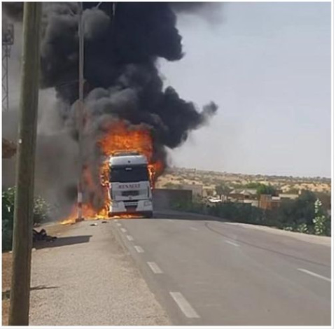 وقد التهم الحريق الشاحنة مع حمولتها بشكل كامل وحولها إلى رماد.