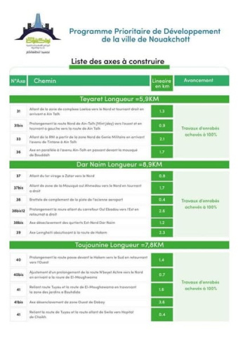 ملخص الحصيلة المرحلية لتنفيذ مكونة الطرق الحضرية في برنامج تنمية مدينة انواكشوط.، تحت هذا العنوان نشرت وزارة التجهيز والنقل، على صفحتها ملخصا لمكونة الطرق الحضرية من المرحلة الأولى من برنامج تنمية مدينة انواكشوط.