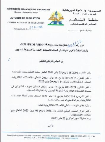 قال المتحدث باسم مستثمرين في سوق الاتصالات السيد الولي ولد احمد إنهم يطالبون بإقالة رئيس سلطة تنظيم الاتصالات ومعاونيه بسبب فشلهم الذريع في تنفيذ القرارات الصادرة عن السلطة المتعلقة بضبط سوق شرائح الاتصال وخاصة القرار رقم 2025/0034 (المرفق)،معربين عن قلقهم ازاء ما تم