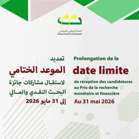 أعلن البنك المركزي الموريتاني عن تمديد الموعد النهائي لاستلام ملفات الترشح لجائزة البحث النقدي والمالي إلى غاية 31 مايو 2026.
