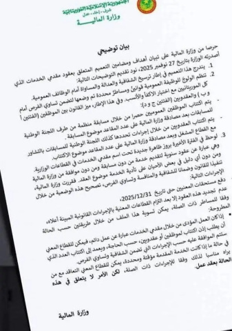 أصدرت وزارة المالية بيانا توضيحيا حول التعميم الصادر مؤخرًا بشأن عقود مقدّمي الخدمات في القطاعات الحكومية، مؤكدة أن الخطوة تأتي ضمن مسار إصلاحي واسع يهدف إلى تعزيز الشفافية وترسيخ العدالة والمساواة في الولوج إلى الوظائف العمومية، إضافة إلى تسوية وضعية العاملين الذين
