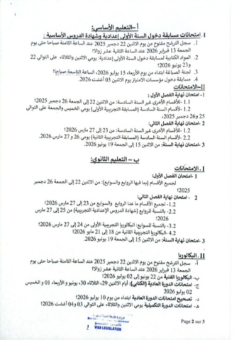 أما شهادة الثانوية العامة "البكالوريا"، فستجرى دورتها العادية أيام 29، 30 يونيو، و1، 2 يوليو 2026، على أن تجرى الدورة التكميلية يومي 3 و4 أغسطس.