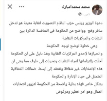 قال نائب رئيس حزب التجمع الوطني للإصلاح والتنمية "تواصل" النائب السابق محمد محمد امبارك إن دعوة من وصفه برئيس حزب النظام، في إشارة إلى حزب الإنصاف الحاكم للتصويت لنقابة عمالية معينة، تدخل فج من...
