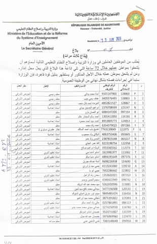 لوحت وزارة التربية وإصلاح النظام التعليمي بفصل 217 موظفا في القطاع إذا لم يلتحقوا بعملهم خلال 72 ساعة.